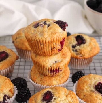These easy blackberry banana muffins are super simple and so delicious! They are moist, fluffy and just perfectly sweet even without much added sugar, thanks to the mashed bananas. They burst with juicy blackberries that add a tart fruity flavor, which balances out the banana taste.