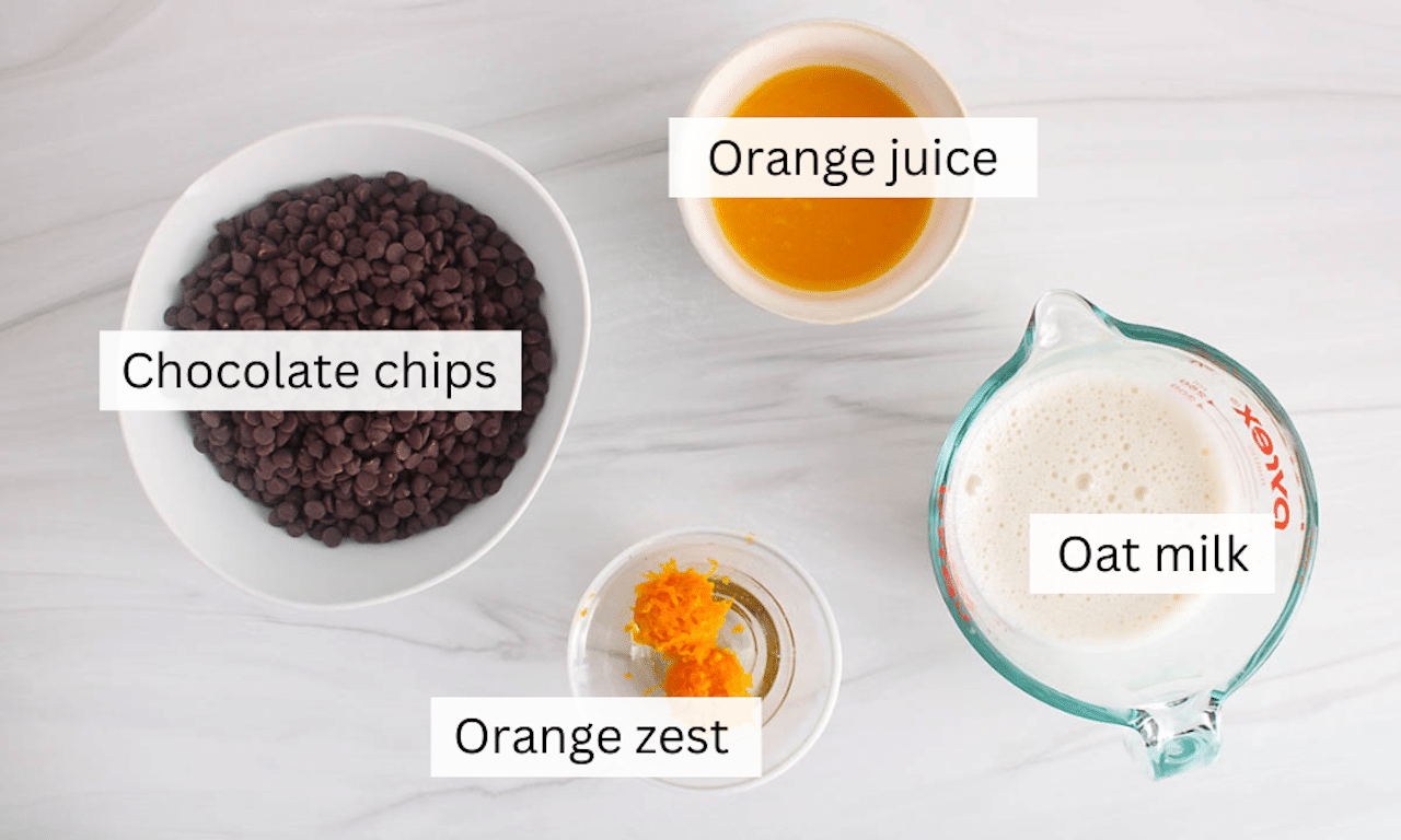 All you need is chocolate chips of your choice, fresh oranges and plant-based milk. This ganache recipe is made without cream or added sugar. That's it! So simple and all made using a microwave.