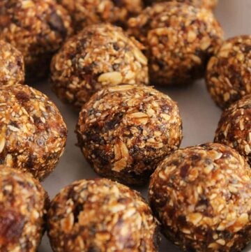 - Dried apricot: Soft-dried apricots work best for making energy balls. I tested with 2 different types of dried apricots: 1- Organic Turkish-style dried apricots from the brand 365 (I had to add 2 tablespoons of water) and 2- Soft and juicy dried apricots from the brand Fruit Bliss (these are slightly re-hydrated so I did not need to add any water). Try to use dried apricots that are soft, without added sugar and unsulfured.